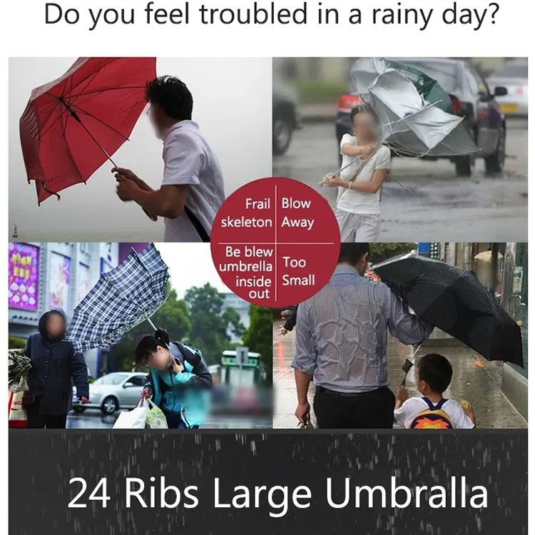 (1) Vynikající odolnost proti větru: Struktura 24 kostí je nejsilnější zárukou pro řešení silného větru, už se nedělejte starosti s rozpaky deštníku, které se při chodu za deštivého počasí vyfoukne.