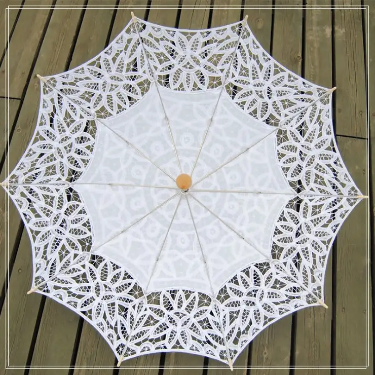 S odkazem na zakřivenou kostru francouzského soudu z 18. století (s průměrem 80-100 cm) je povrch deštníku vyroben z asymetrického vyzařujícího krajkového sestřihu a okraje jsou zdobeny ručně plenkou bavlněné pulty 3-5 cm.